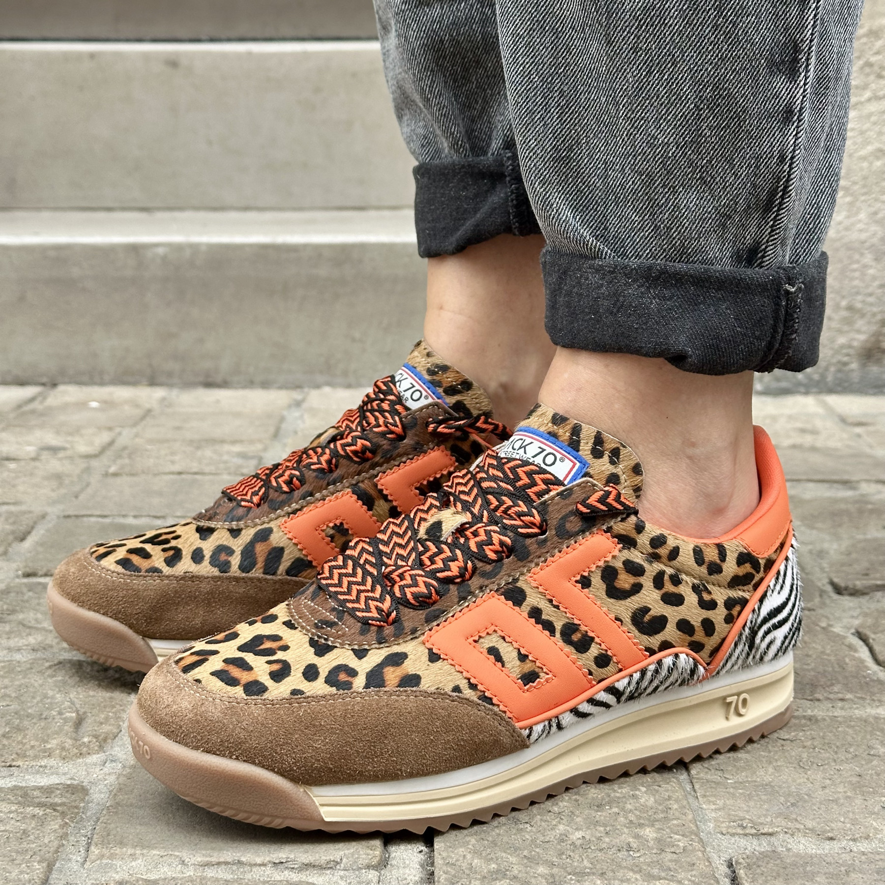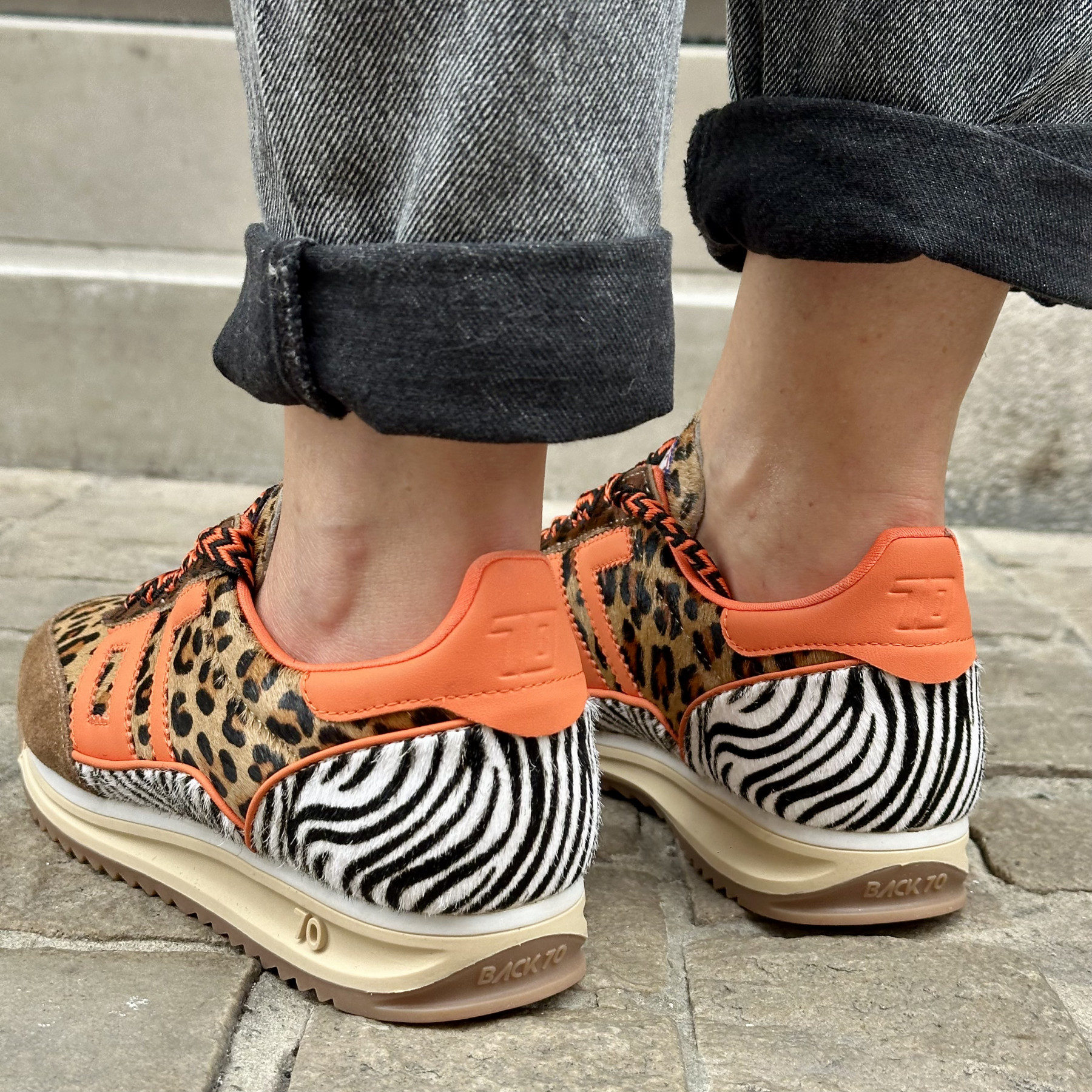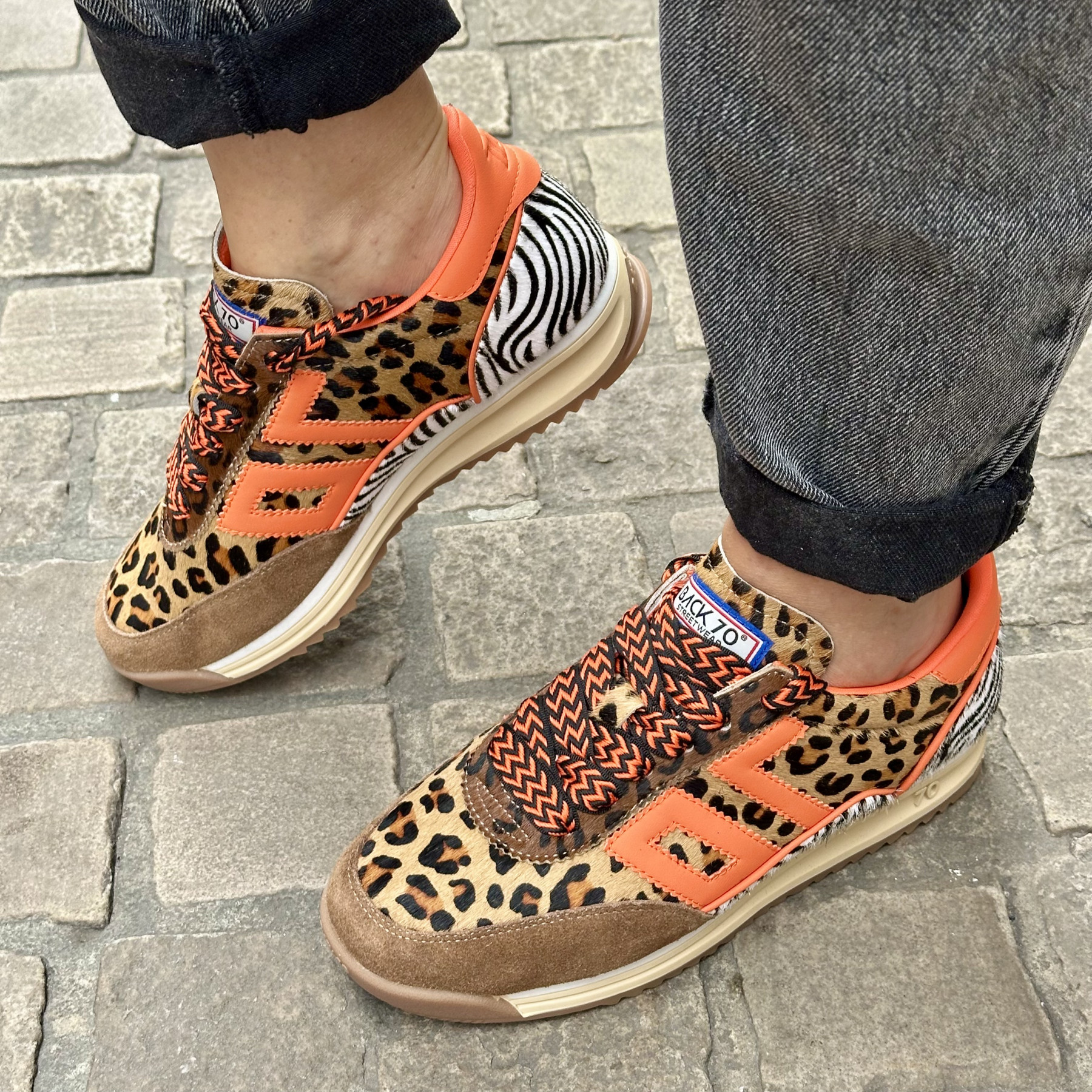 Tige : textile poils imprimé léopard + empiècements en cuir suédé marron.