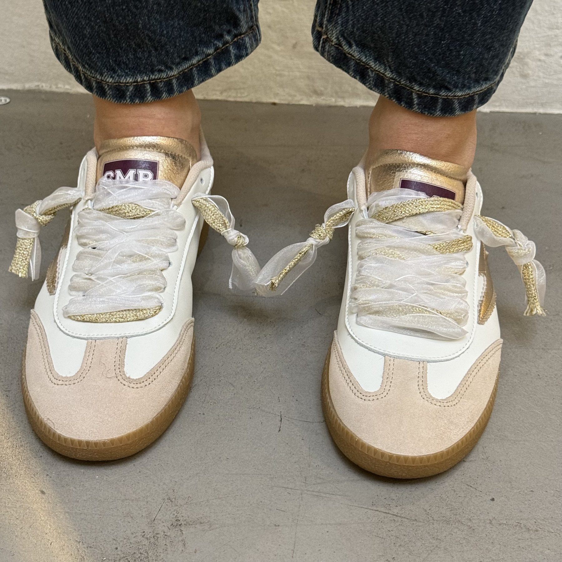 Fermeture : double lacets en coton gold et en dentelle
