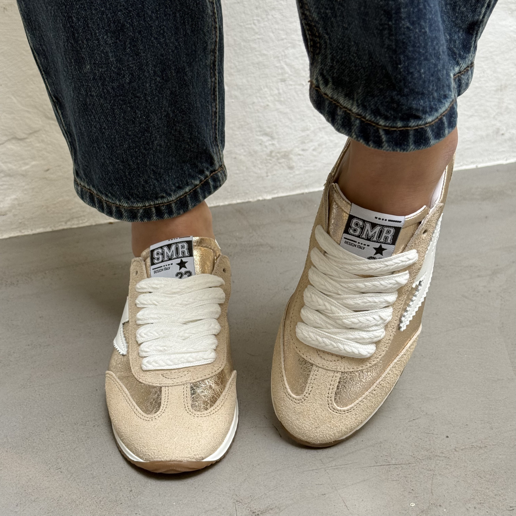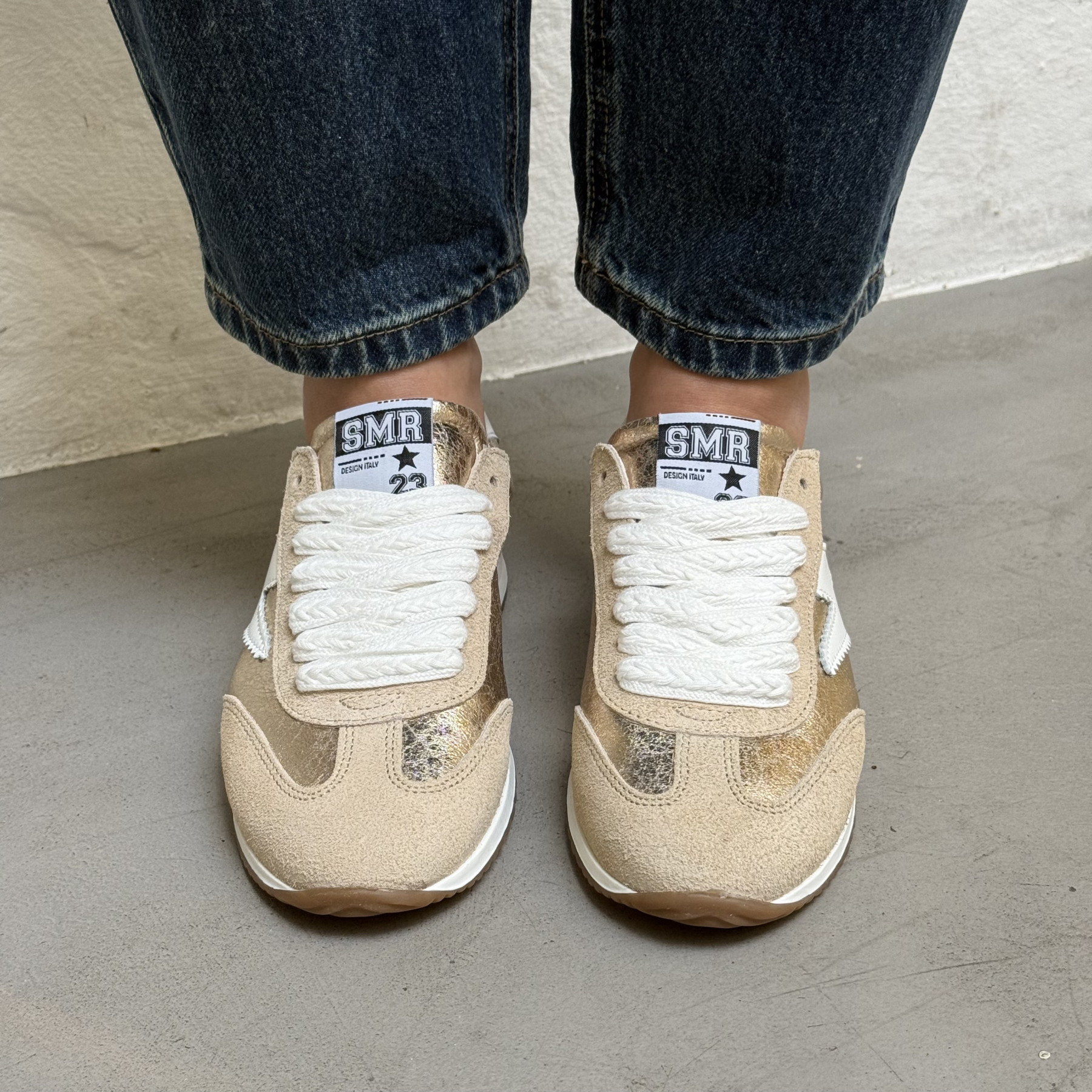 • Mélange de suédine beige et de cuir doré métallisé pour un rendu élégant.