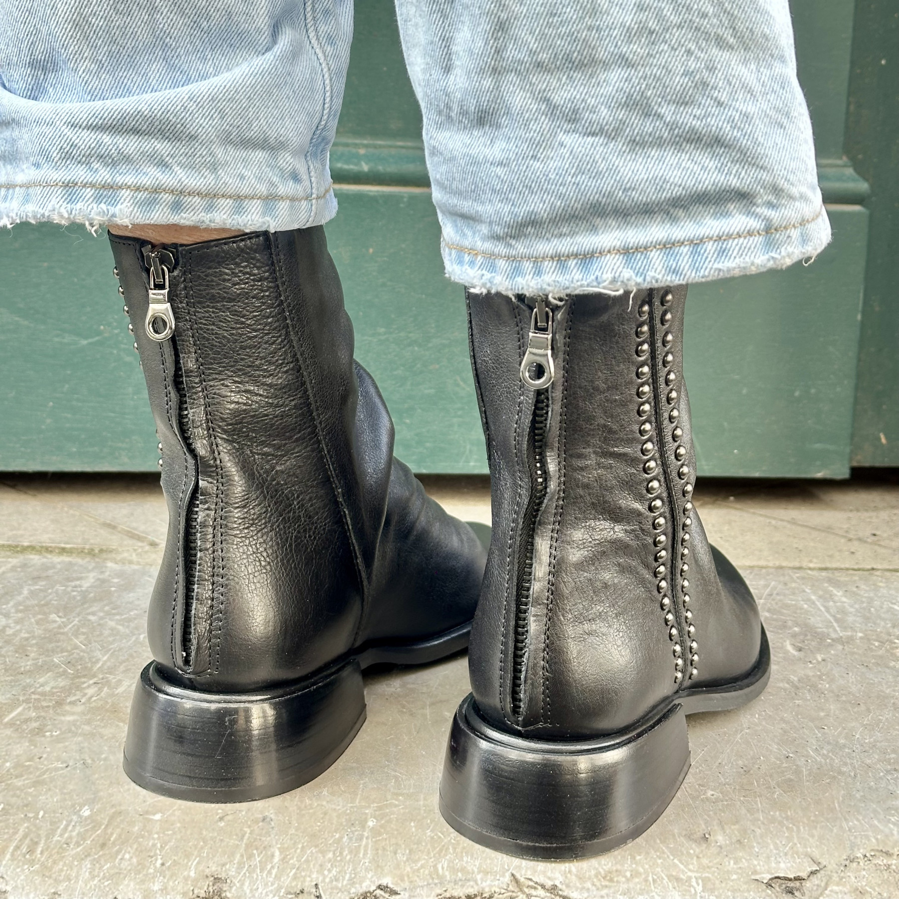 • Bottines rock chic en cuir noir souple et légèrement grainé.