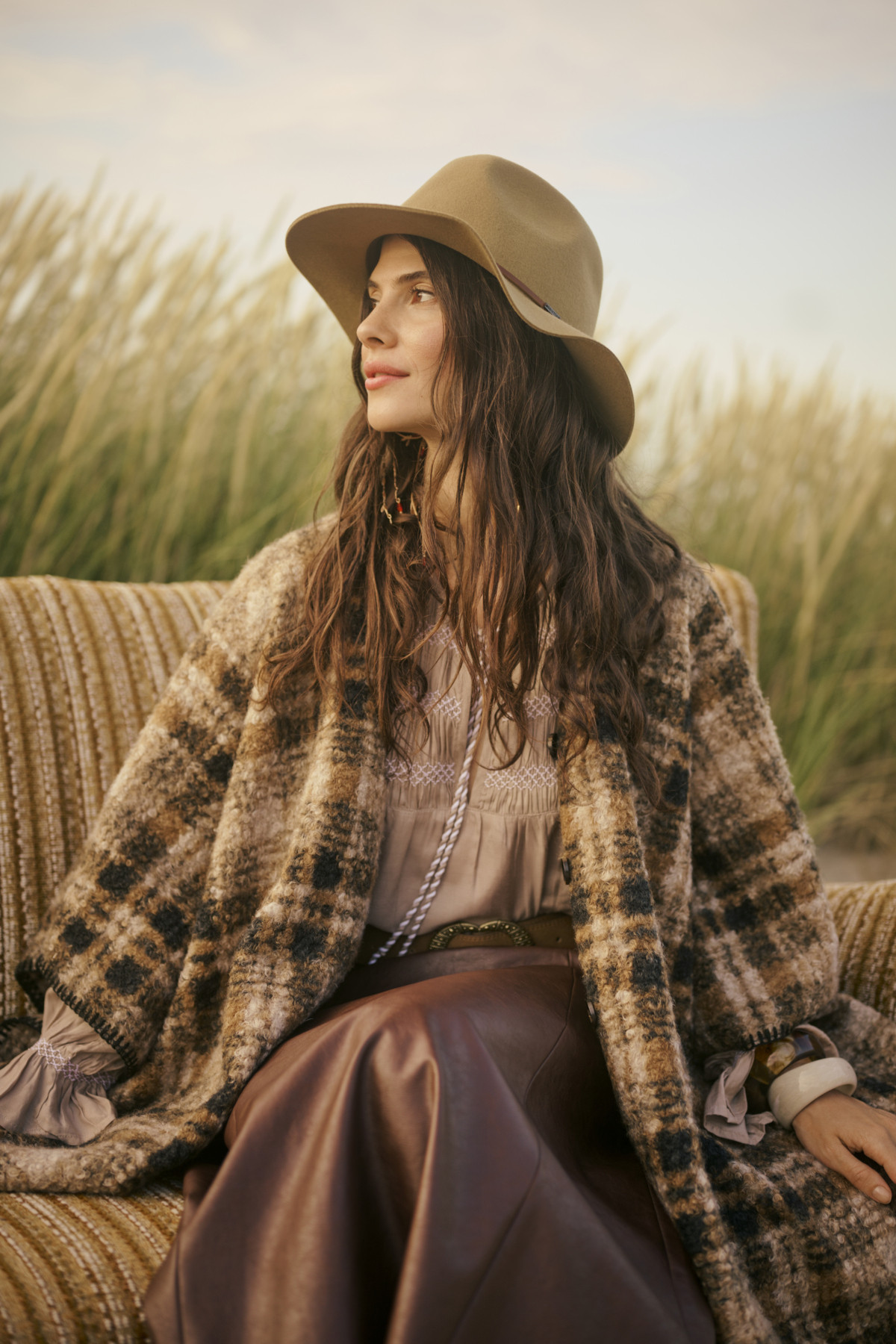 cape femme à imprimé carreaux dans des tons naturels de beige, camel et marron. Confectionné dans une matière chaude et texturée, il offre une coupe ample et enveloppante, idéale pour la saison automne-hiver. Son style bohème chic apporte du caractère à toutes vos tenues, du quotidien aux looks plus habillés.