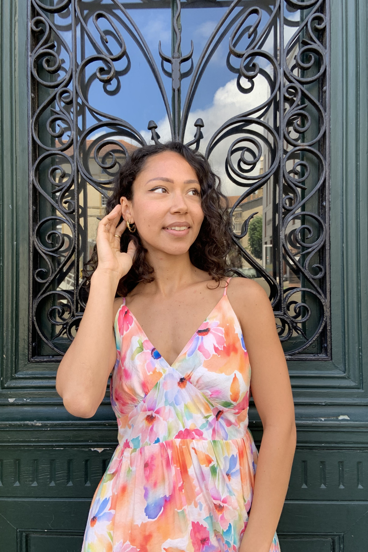 Robe longue motif fleurie orange, bleur, rose, violet, vert à bretelles