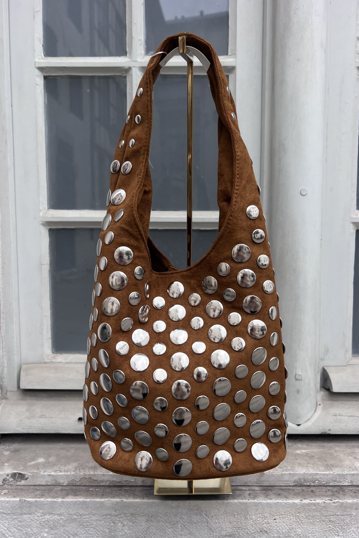 chummy sac en daim camel à gros oeillets métalliques argentés 1