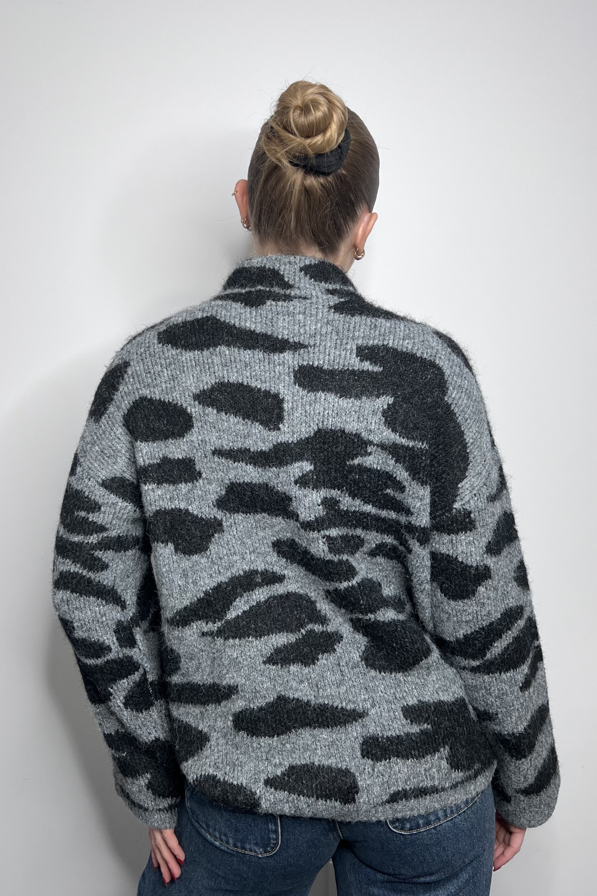 • Pull CREAM en maille épaisse et duveteuse au motif animalier gris et noir, pour un look tendance et affirmé.