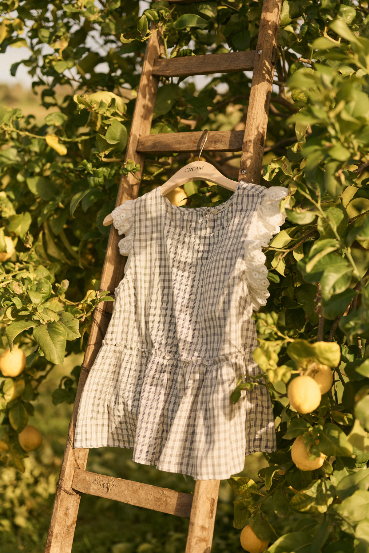 Top à carreaux coupe droite avec bas peplum froncé. Encolure ronde et larges manches ornées de volants brodés. Couture visible à la taille. Aspect léger et structuré.