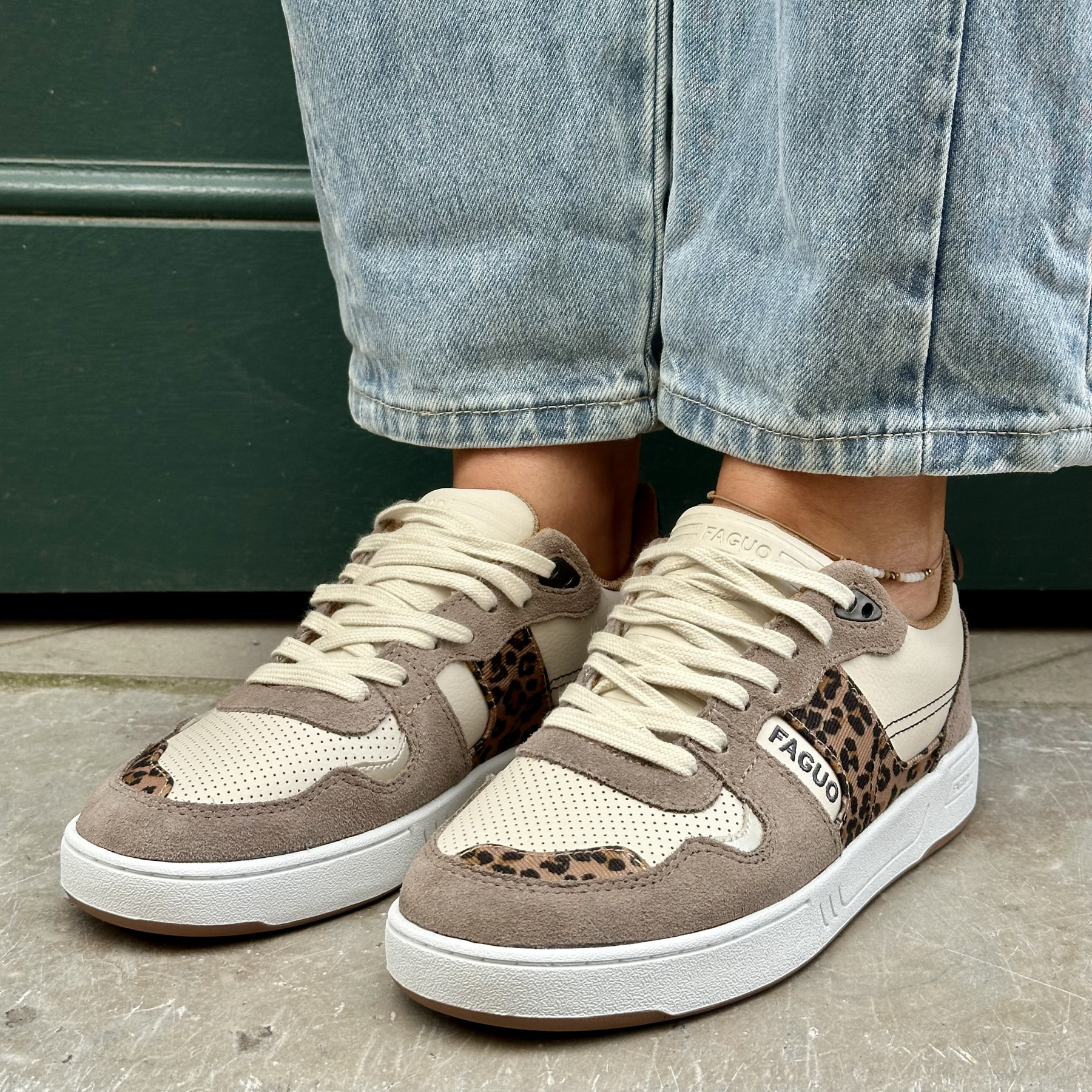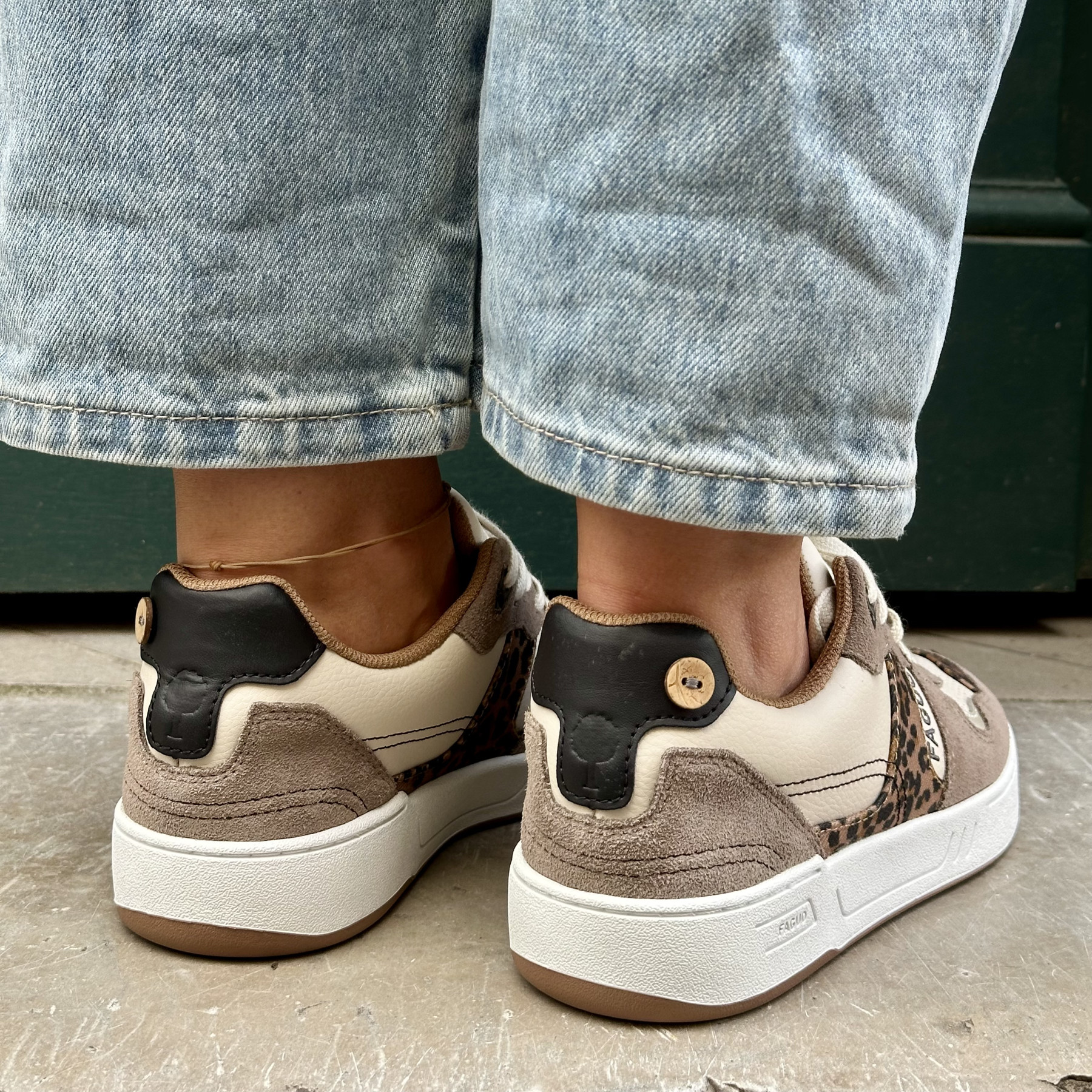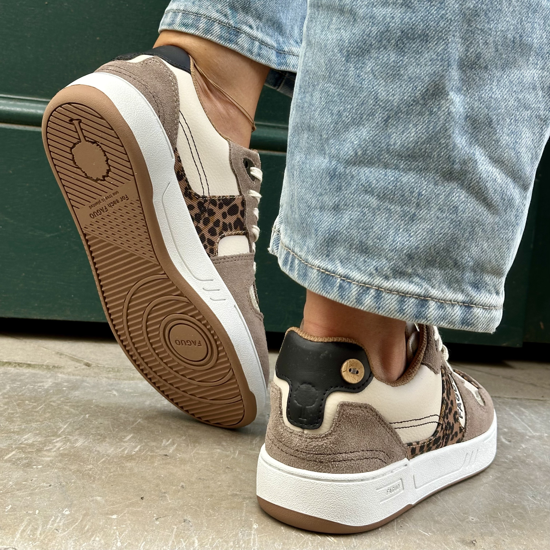 Tige : cuir suédé taupe + textile beige + empiècements synthétiques imprimé léopard.