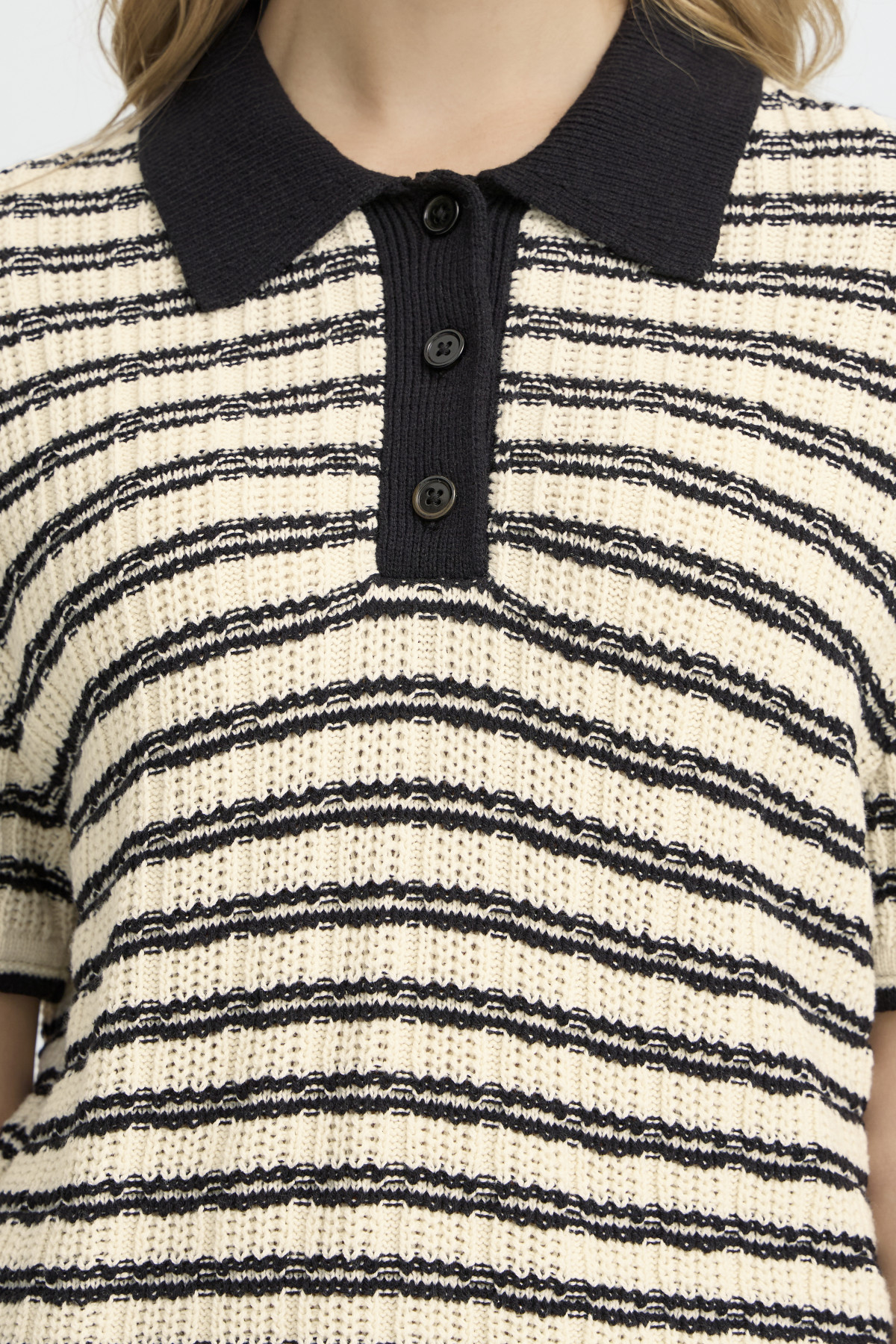• Col polo contrastant noir avec patte de boutonnage.