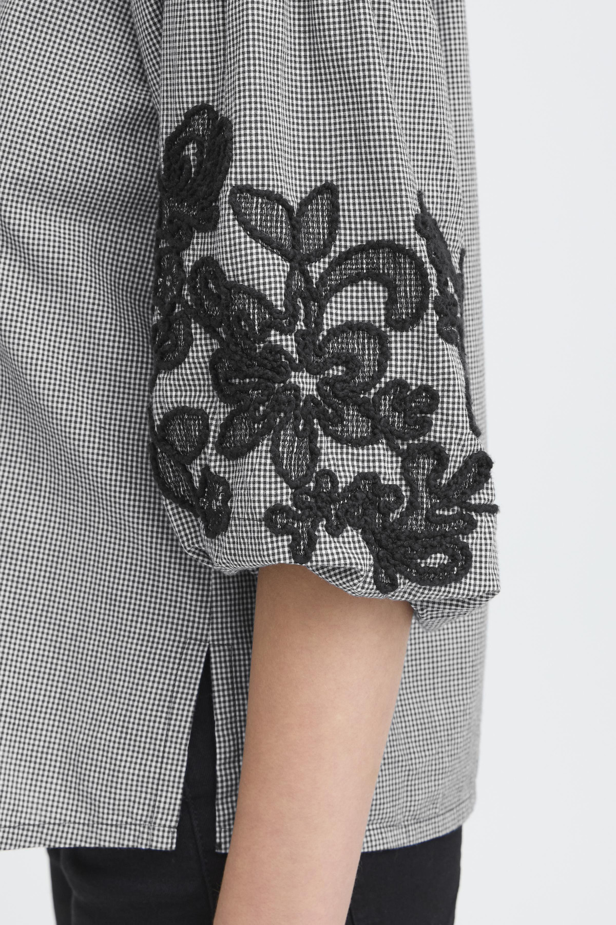• Empiècements en dentelle noire sur les manches, détail sophistiqué et contrastant.