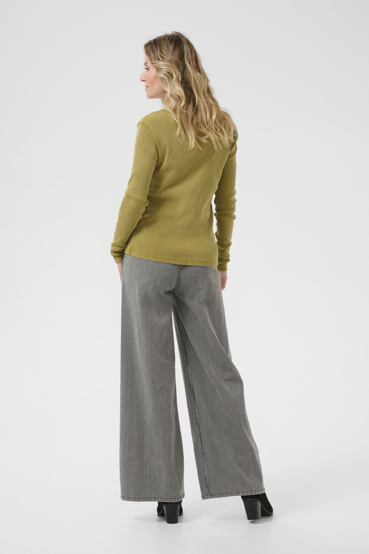 T-shirt femme à manches longues en maille côtelée, coloris vert kaki. Sa coupe ajustée et son col en V délicatement boutonné offrent une silhouette féminine et élégante. Confortable et facile à associer, ce basique revisité est idéal pour un look casual chic au quotidien.