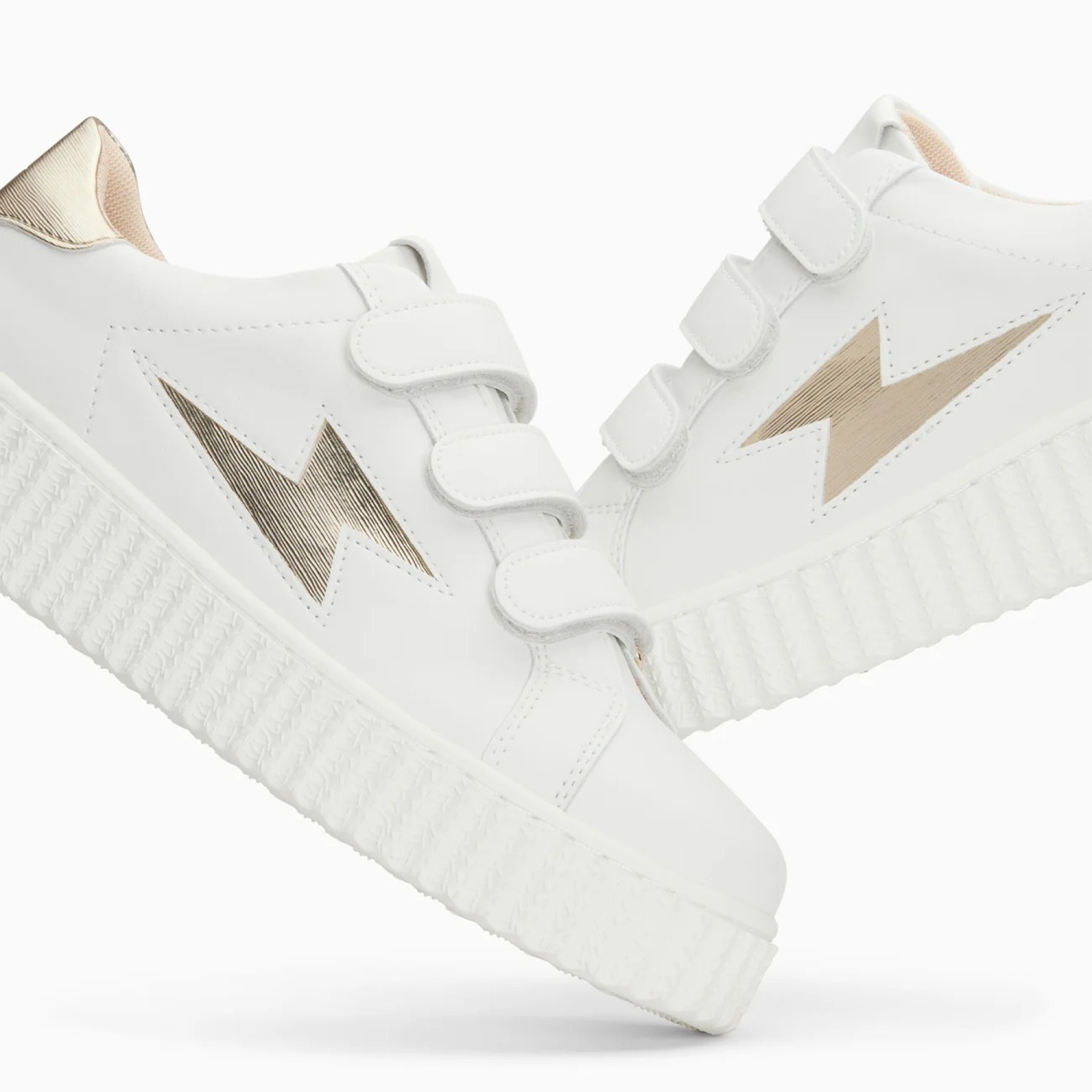 • Découpe en forme d'éclair et patch arrière en similicuir or effet strié